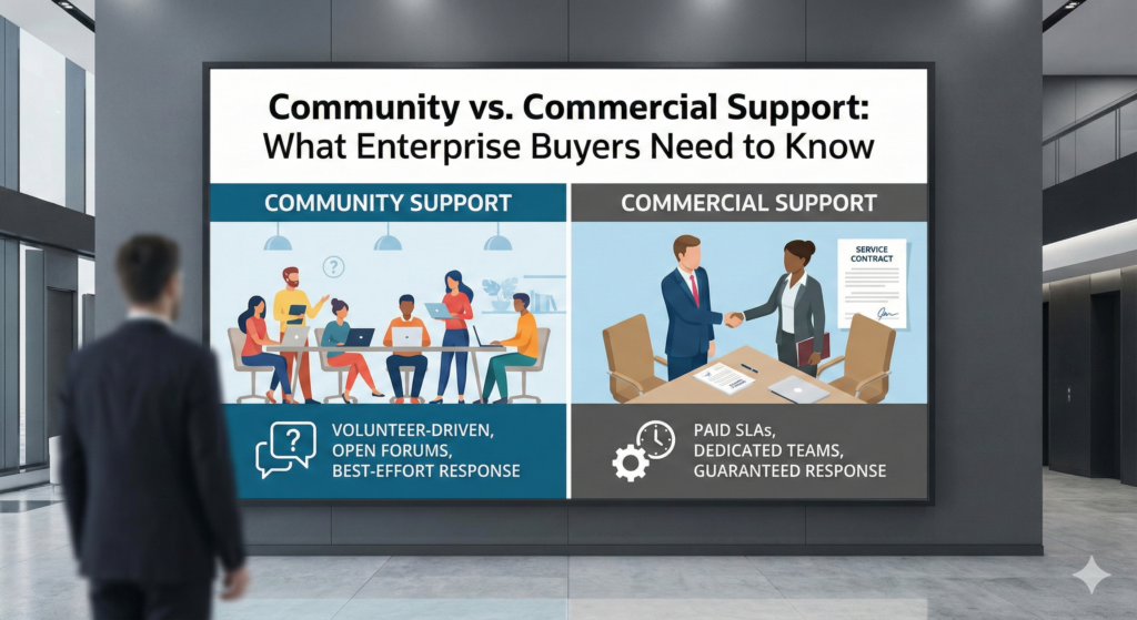 What makes community support particularly challenging for enterprise buyers is the complete absence of guarantees. Nobody owes you a response. Nobody has committed to solving your problem within any timeframe. If your production system is down and costing your company thousands of dollars per hour, the community doesn’t have any obligation to prioritize your emergency over the interesting technical discussions they’d rather be having. This unpredictability is inherent to the model, and it’s something every enterprise needs to consider seriously when evaluating open source software support options.